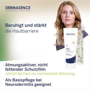 Parfümfreie Pflege für trockene bis sehr trockene, raue und schuppige Haut. Die Pflege ahmt das natürliche Sebum der Haut nach, um die Hautbarriere zu stärken. Für eine glattere und weniger raue Haut. Zusätzlich erzeugt die Pflege einen angenehmen, atmungsaktiven und nicht fettenden Schutzfilm, der die Haut vor mechanischen Belastungen schützt. Die Pflege enthält auch Bisabolol, das die Haut beruhigt und Spannungsgefühle nimmt. Diese Pflege ist besonders geeignet im Rahmen einer Intervallbehandlung bei Neurodermitis und kann auch für Kinder ab 3 Jahren verwendet werden. Die Creme ist dermatologisch getestet und zieht sofort ein, was sie auch ideal für empfindliche Kinderhaut macht.