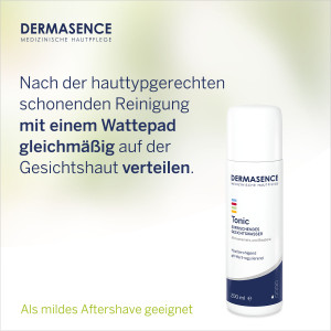 Das DERMASENCE Tonic ist die perfekte Ergänzung zur täglichen Gesichtsreinigung. Das erfrischende Tonic hilft, den natürlichen pH-Wert der Haut wiederherzustellen und unterstützt eine gesunde Hautflora. Die Formulierung enthält Hamamelis und Bisabolol sowie Panthenol und Allantoin, um die Haut zu pflegen, zu beruhigen und mit Feuchtigkeit zu versorgen. Mit einem geringen Alkoholanteil von nur 5 % ist es besonders hautverträglich und kann auch als mildes Aftershave verwendet werden. Das Tonic kann bei Bedarf auch nach der Rasur verwendet werden. Hautfreundlich parfümiert und dermatologisch getestet.
