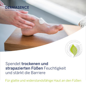 Pflegetipp: Ein sofortiges Anziehen, wie z.B. von Kompressionsstrümpfen, ist möglich. Bei starken Verhornungen als Vorbehandlung die DERMASENCE Mycolex Schrundencreme anwenden.