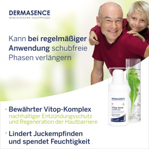 Die DERMASENCE Vitop forte Augenpflege wurde speziell entwickelt für sehr trockene, juckende und zu Neurodermitis neigende Haut im Augenbereich. Die einzigartige Vitop-Formulierung regeneriert Ihre Hautbarriere mit hautidentischen Ceramiden und lindert Juckreiz, Rötungen und Irritationen durch eine beruhigende Wirkung von Bisabolol. Durch die intensive Feuchtigkeit von Hyaluron wird Ihre Haut zudem hydratisiert und geschützt. Verlängern Sie schubfreie Phasen durch regelmäßige Anwendung. Parfümfrei und dermatologisch getestet.